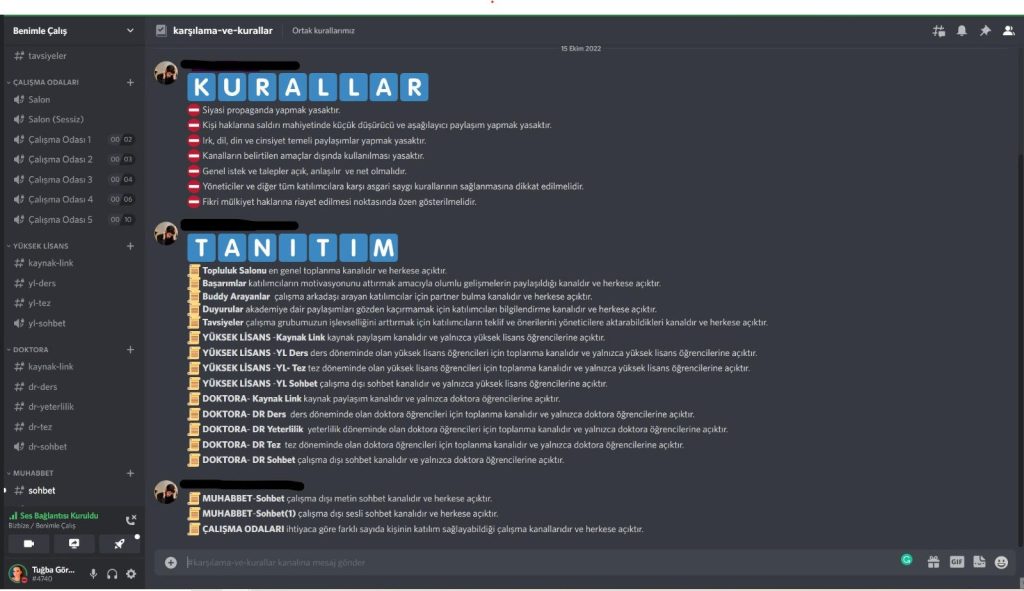 Doktora ve yüksek lisans öğrencilerinin tez yazma süreçlerinde yaşadıkları zorluklara karşı bir çözüm olarak geliştirilen “Benimle Çalış” topluluğu, aday öğrencileri, mesajlaşma ve dijital dağıtım platformu Discord üzerinden bir araya getiriyor. Lisansüstü öğrencilerine yardımcı olabilecek çeşitli verilerin ve kaynakların paylaşılıp ortak erişime sunulacağı kanallar, görüntülü ve sesli çevrimiçi çalışma odaları ve sohbet odalarıyla “Benimle Çalış”, tez sürecinde ve öncesinde yaşanan motivasyon sorunlarını aday öğrencilerin bir araya gelmesiyle çözmeyi vaat ediyor.